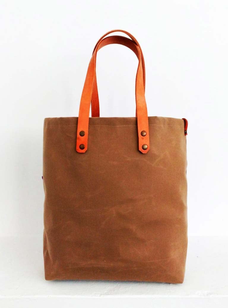 Bolsa hecha en Barcelona con tejido de lona acrílica y doble asa de piel natural.